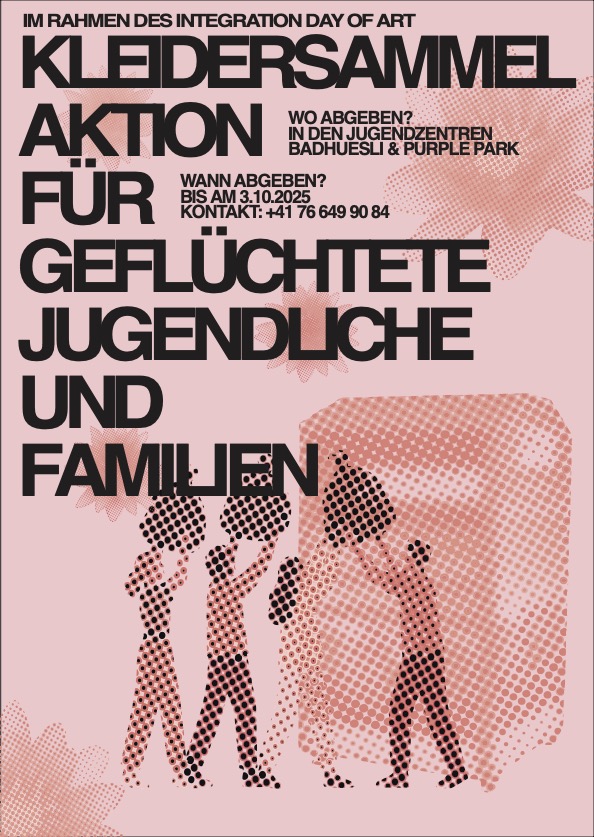 Die Kleidersammlungsaktion für den Free Cloth Shop am Integration Day of Art. Bis zum 03.10. werden in den Jugendzentren Badhuesli & Purple Park Kleiderspenden entgegen genommen.